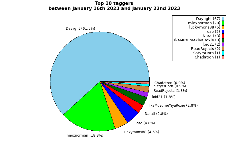 | Top 10 taggers between January 16th 2023 and January 22nd 2023 | ||