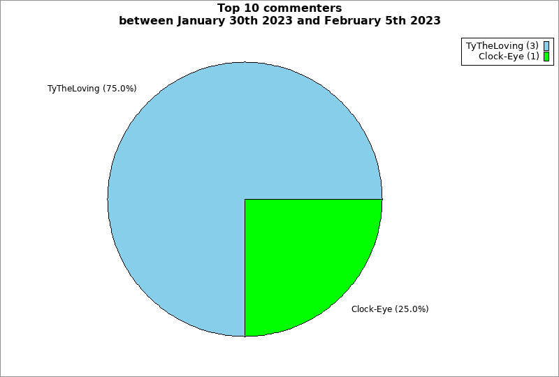 | Top 10 commenters between January 30th 2023 and February 5th 2023 | ||