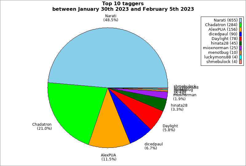 | Top 10 taggers between January 30th 2023 and February 5th 2023 | ||