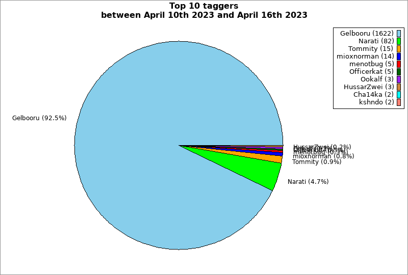 | Top 10 taggers between April 10th 2023 and April 16th 2023 | ||
