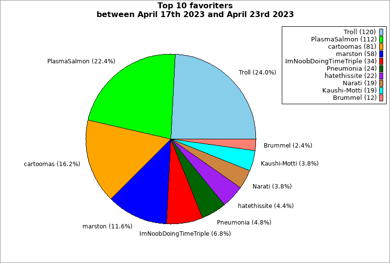| Top 10 favoriters between April 17th 2023 and April 23rd 2023 | ||