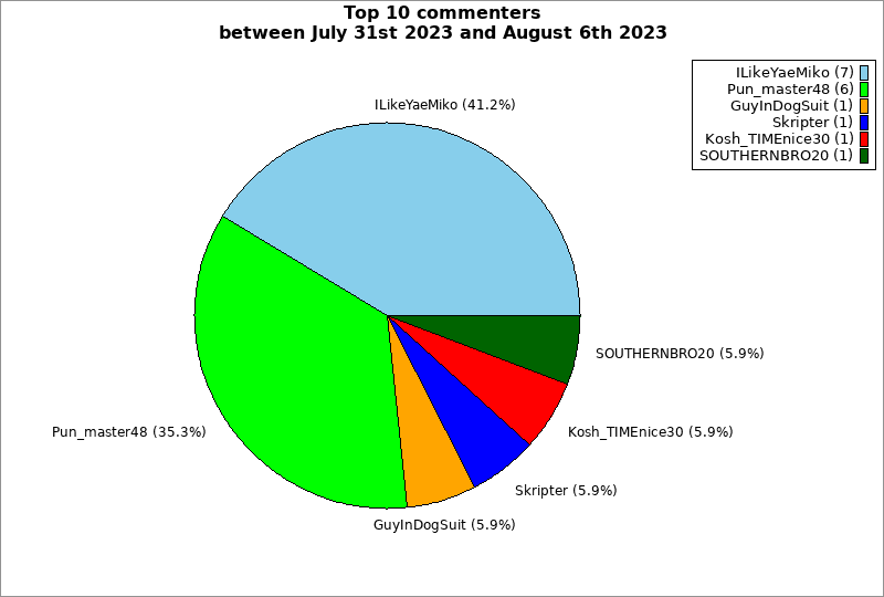 | Top 10 commenters between July 31st 2023 and August 6th 2023 | ||