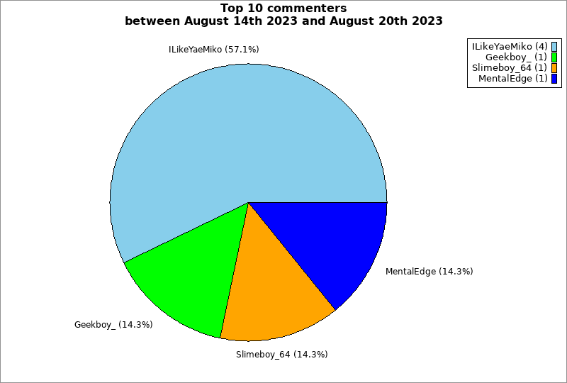 | Top 10 commenters between August 14th 2023 and August 20th 2023 | ||