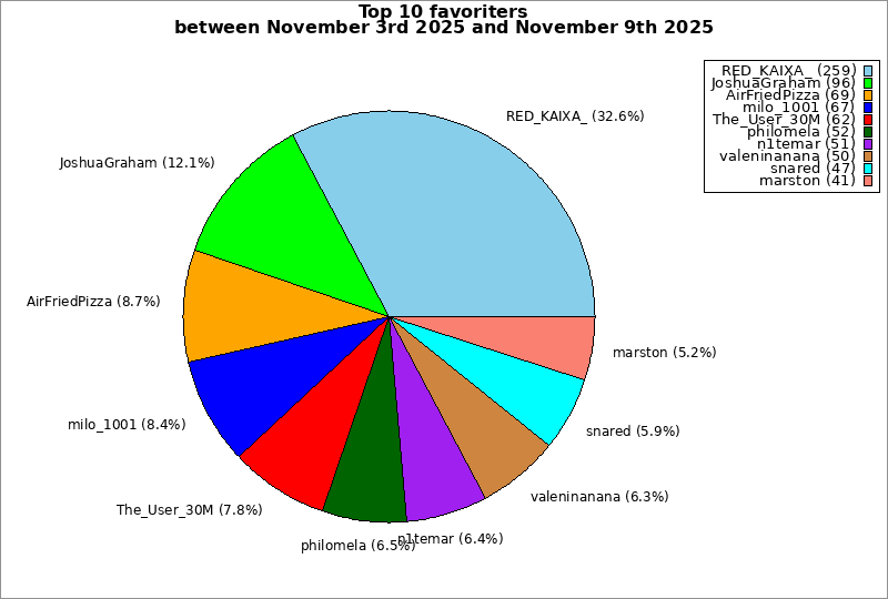 | Top 10 favoriters between November 3rd 2025 and November 9th 2025 | ||